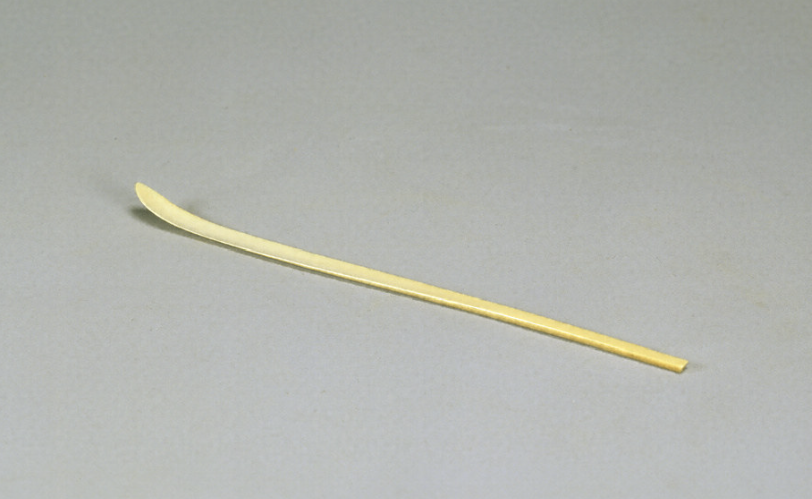 中国では茶が粉末状で飲まれていたため、茶を掬う(すくう)「匙」が必要不可欠でした。材質は金・銀・象牙・鼈甲・竹など多様で、「薬匙(やくさじ)」とも呼ばれ、茶葉を計る道具として機能していました。唐代の『茶経』では、茶匙に「測」という文字をあて、計量器の役割を果たしていたことがわかります。