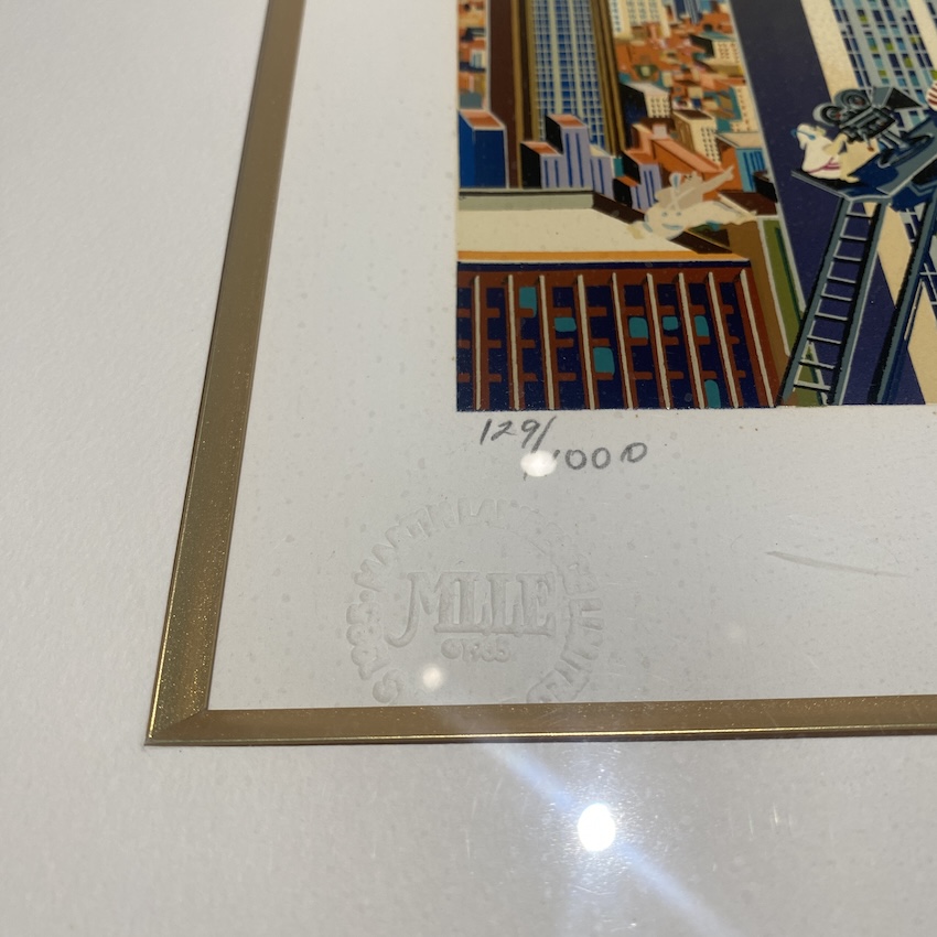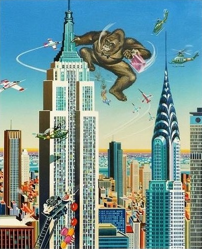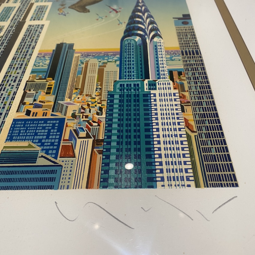 作品タイトルは「4大都市・ニューヨーク」です。ヒロ・ヤマガタの特徴である、鮮やかな色彩と緻密な構図が印象的で、ニューヨークの街に現れた、キング・コングをユーモラスに描いています。