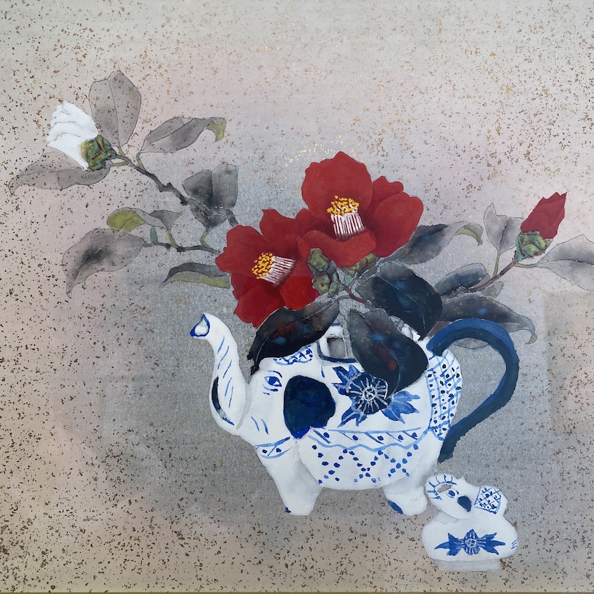 河出幸之助の日本画を買取いたしました。象の形をしたポットに生けられた赤い椿と、後ろに置かれた白い椿とのコントラストが、柔らかな背景の中でいっそう際立っています。