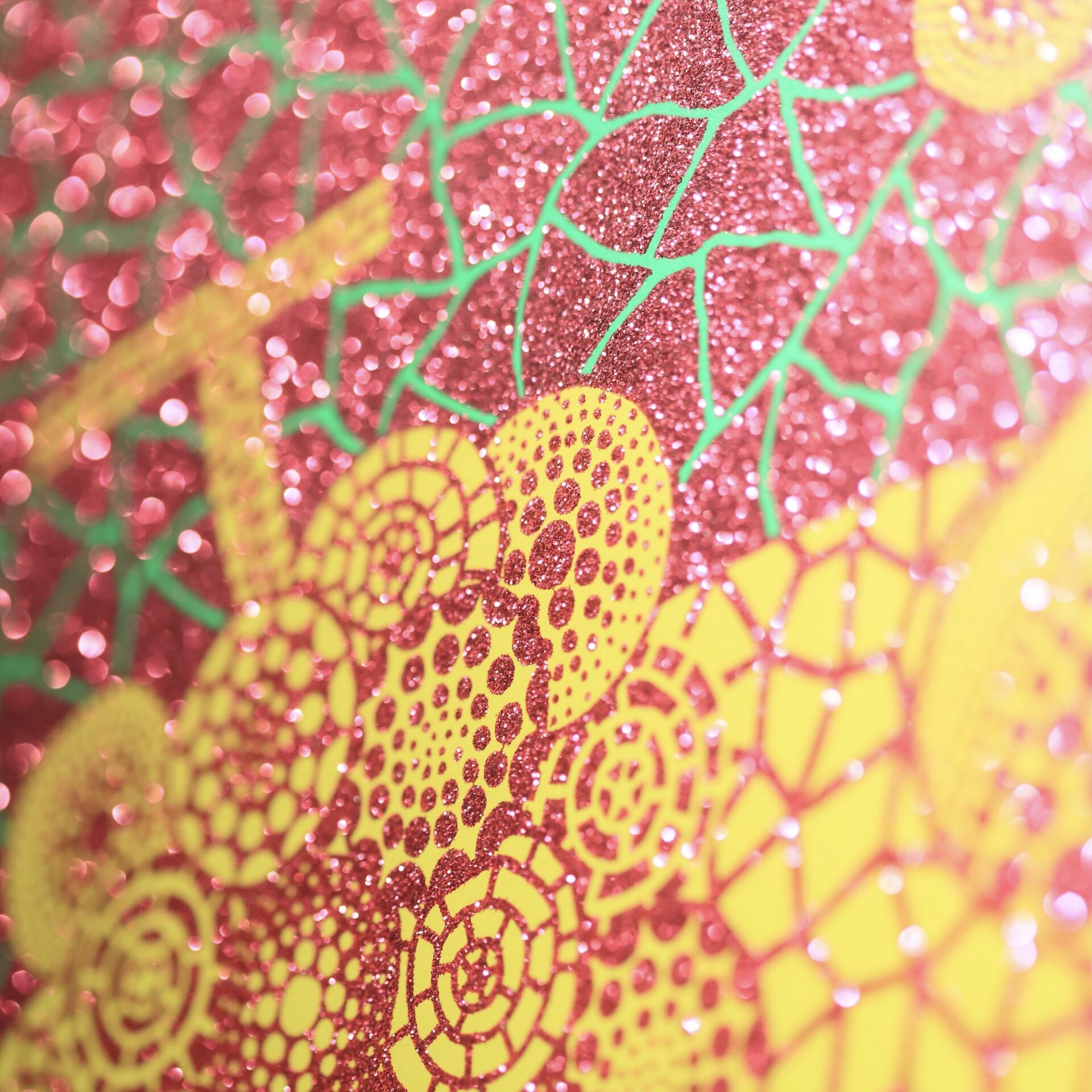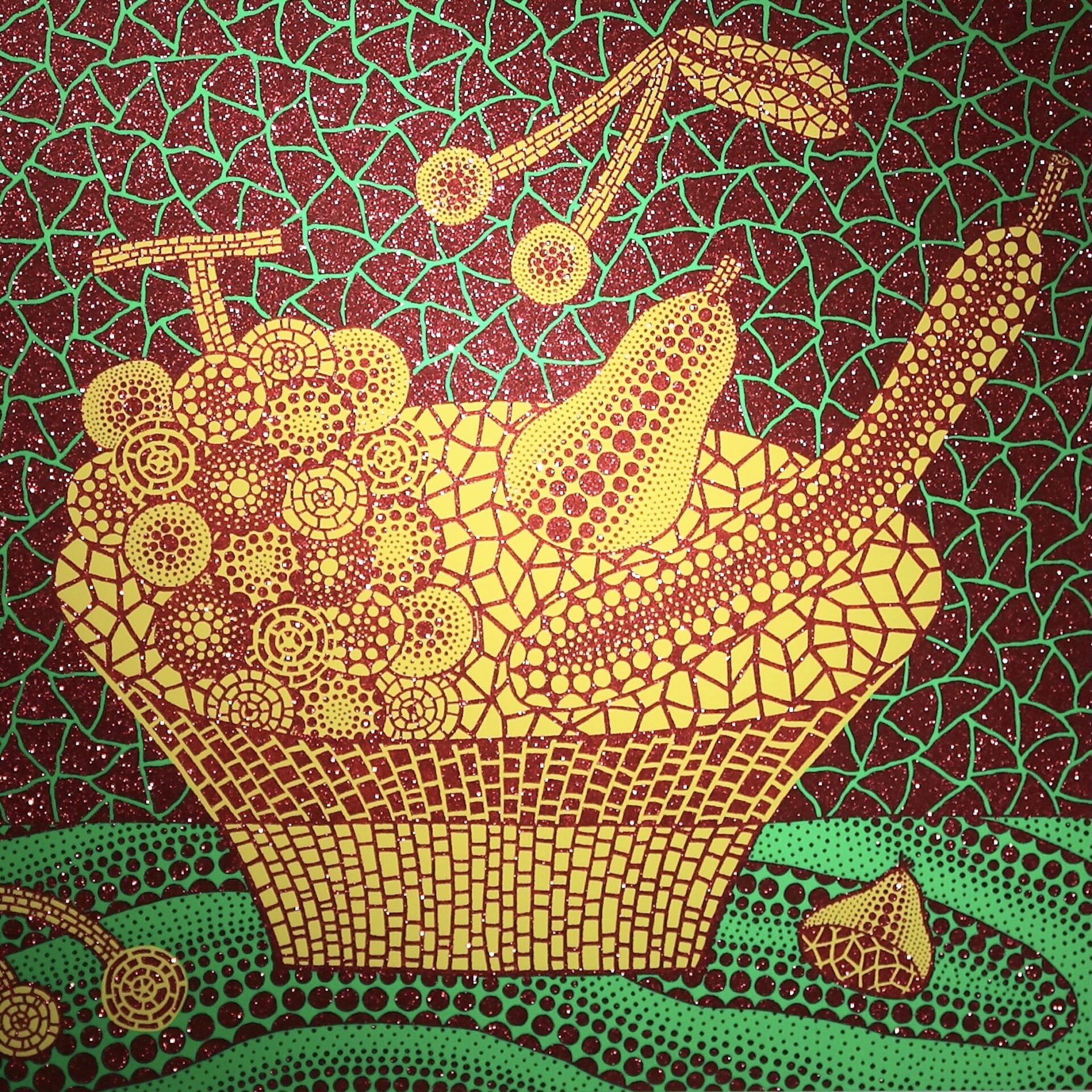 1979年から発表を始めた版画制作では、抽象的な死や苦悩のテーマから一転し、果物や花、蝶、かぼちゃなど日常的なモチーフを水玉や網目で彩り、明快な色彩とともに表現しました。