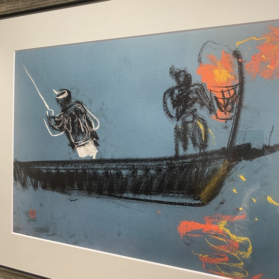加藤の画風は、一貫して風景や人物に取材した具象表現を基盤としながら、色面や形態の構成に独自の緊張感を持たせているのが特徴です。特に岐阜の伝統や風土に根ざした題材は、画家の故郷への強い思いを感じさせます。今回の「鵜飼」のパステル画も、その代表的な題材のひとつで、清流長良川の夏の風物詩を鮮やかに描き出しています。